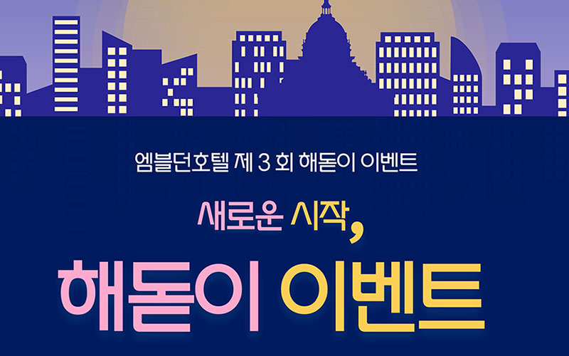 엠블던호텔 이벤트 Embledon Hotel Event 감각부터 다른 엠블던호텔만의 이벤트를 만나보세요. 26년 새해, 해돋이 이벤트 도심 속 해돋이 명소 엠블던호텔 2026년 1월 1일 해돋이 이벤트 사전 예약 오픈! 기간 2026-01-01 오전 7시~8시 자세히 보기 불멍타임 이벤트 도심 속 불빛 아래, 맥주와 마시멜로우로 완성되는 여유 엠블던호텔 해밀시아 BAR 테라스에서 느긋한 불멍 타임을 즐겨보세요! 기간 2025/11/11 ~ 계속 자세히 보기 [예약 혜택] 송년회, 신년회, 기업연회 예약 이벤트 송년파티 & 연말모임은 엠블던과 함께! 서둘러 예약하시고 할인 혜택 받으세요. 기간 2025/07/15 ~ 계속 자세히 보기 얼리버드 예약, 얼리 체크인 미리 예약하시고 더 일찍 체크인 하세요! 일주일 전 예약시 얼리체크인 13시 혜택 기간 2024/12/27 ~ 계속 자세히 보기 엠블던호텔 상품권 출시 엠블던호텔 상품권으로 소중한 분들께 품격을 선물하세요. 기간 2022/11/04 ~ 계속 자세히 보기 1