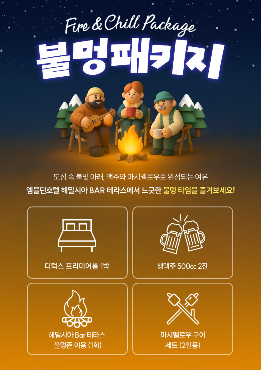 패키지 상세 혜택 불멍패키지 도심 속 불빛 아래, 맥주와 마시멜로우로 완성되는 여유엠블던호텔 해밀시아 BAR 테라스에서 느긋한 불멍 타임을 즐겨보세요! 패키지 기간 : 2025/11/11 ~ 계속 TEL : 031-413-2222 패키지 혜택 [불멍 패키지]★ 타입· 디럭스 프리미엄룸 + 불멍존 이용 + 생맥주 500cc2잔 + 구워먹는 마시멜로우 세트· 디럭스 프리미엄트윈룸 + 불멍존 이용 + 생맥주 500cc2잔 + 구워먹는 마시멜로우 세트★ 이용금액· 평일 기준 129.000· 주말 기준 147.000★ 운영시간 : 수~일 18시~22시 운영패키지 문의전화 031-413-2222 패키지 기간 2025/11/11 ~ 계속 패키지 예약 목록 이전 패키지 엠블던 크리스마스 BOX 패키지 다음 패키지 Sweet Day 패키지