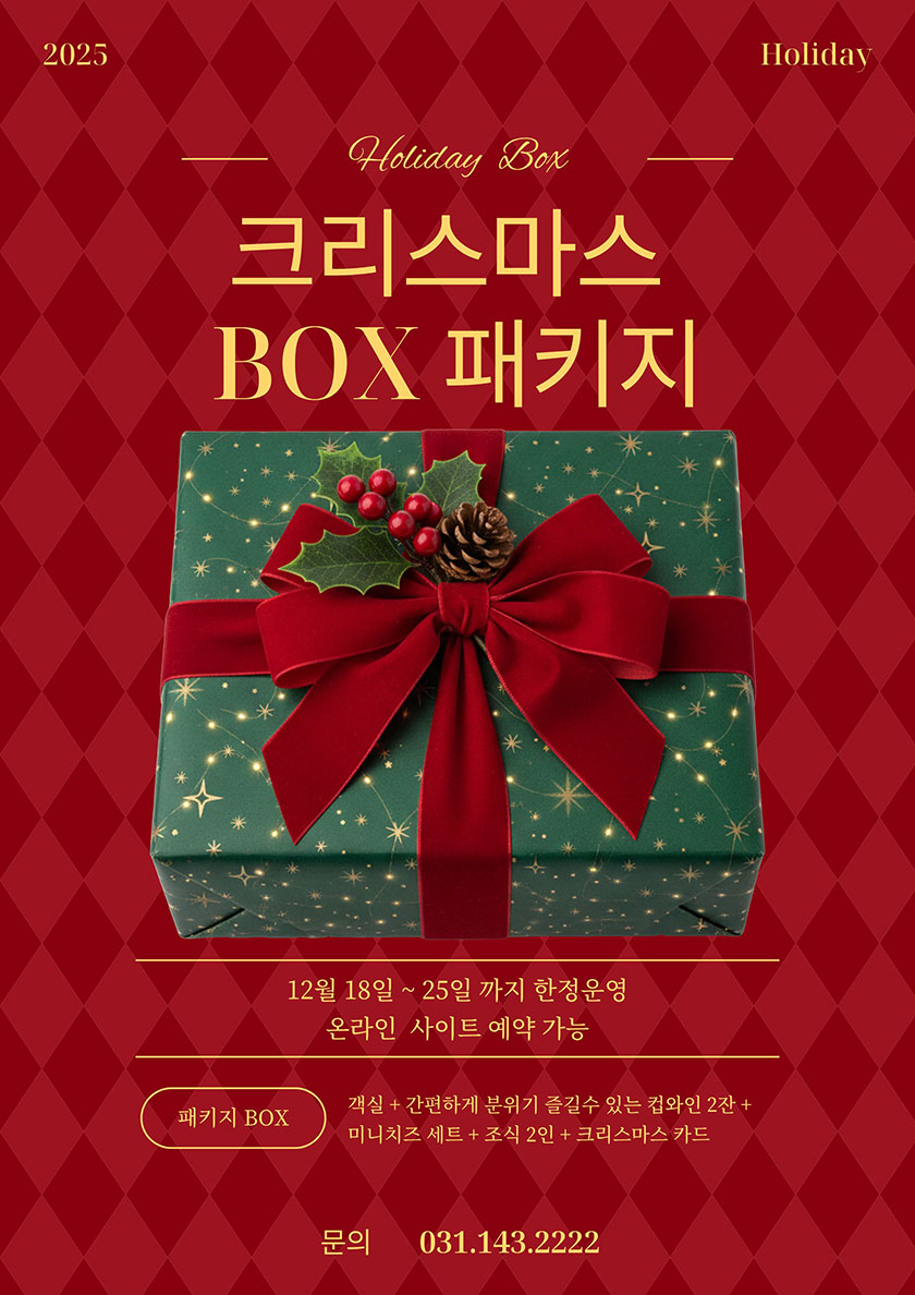 패키지 상세 혜택 엠블던 크리스마스 BOX 패키지 사랑하는 연인과 함께하는 로맨틱한 크리스마스엠블던호텔에서 잊지 못할 순간을 만들어보세요. 패키지 기간 : 2025/12/18 ~ 2025/12/25 TEL : 031-413-2222 패키지 혜택 [크리스마스 BOX 패키지]디럭스 프리미엄룸 or 트윈룸+ 컵와인 2잔+ 미니치즈 세트+ 크리스마스 카드+ 조식2인★ 가격 / 198,000원 패키지 기간 2025/12/18 ~ 2025/12/25 패키지 예약 목록 이전 패키지 26년 새해, 해돋이 패키지 다음 패키지 불멍패키지