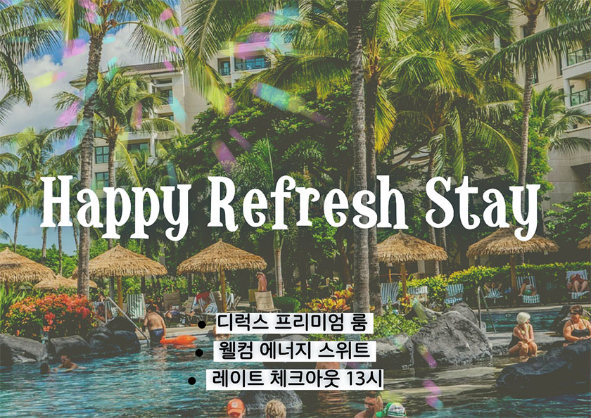 패키지 상세 혜택 해피 리프레시 스테이 패키지 새학기, 새출발 시즌 및 3월 20일 행복의 날 맞아 고객님께 소소한 즐거움을 제공해 드립니다. 패키지 기간 : 2026/03/09 ~ 2026/03/31 TEL : 031-413-2222 패키지 혜택 [해피 리프레시 스테이 패키지]★ 디럭스 프리미엄 룸 + 웰컴 에너지 스위트 + 레이트 체크아웃 13시★ 2026년 3월31일까지 (주중판매 : 일~ 목요일)패키지 문의전화 031-413-2222 패키지 기간 2026/03/09 ~ 2026/03/31 패키지 예약 목록 이전 패키지 이전 패키지가 없습니다. 다음 패키지 애프터 워크 비어 스테이