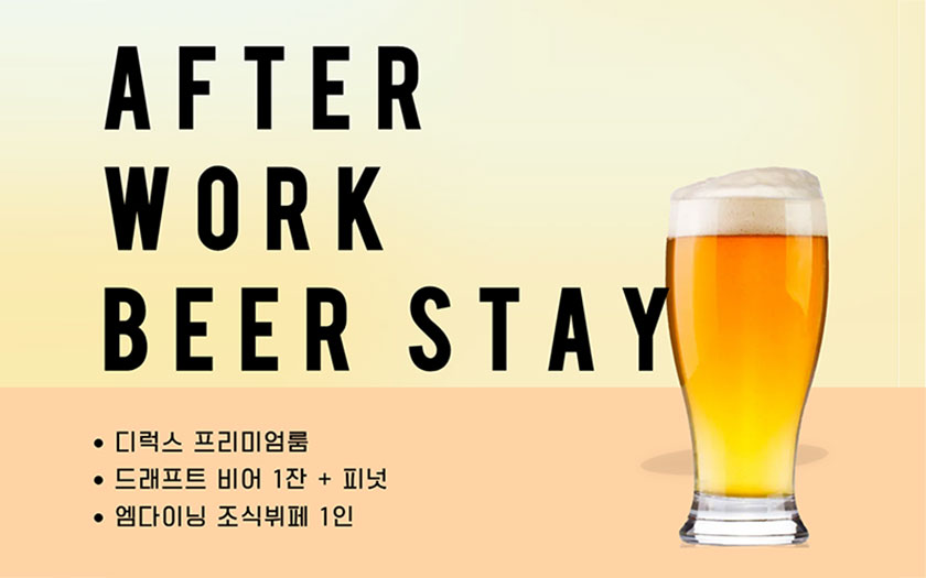패키지 상세 혜택 애프터 워크 비어 스테이 바쁜 하루를 마친 당신을 위한 작은 휴식출장객 및 1인 투숙객 위한 힐링형 패키지 패키지 기간 : 2026/03/09 ~ 계속 TEL : 031-413-2222 패키지 혜택 [애프터 워크 비어 스테이]★ 디럭스 프리미엄 룸 + 애프터워크 드래프트 비어 1잔 + 피넛 + 엠다이닝 조식 뷔페 1인 ★ 해밀시아 바 18:00 ~ 22:30패키지 문의전화 031-413-2222 패키지 기간 2026/03/09 ~ 계속 패키지 예약 목록 이전 패키지 해피 리프레시 스테이 패키지 다음 패키지 커플 칵테일 스테이 패키지