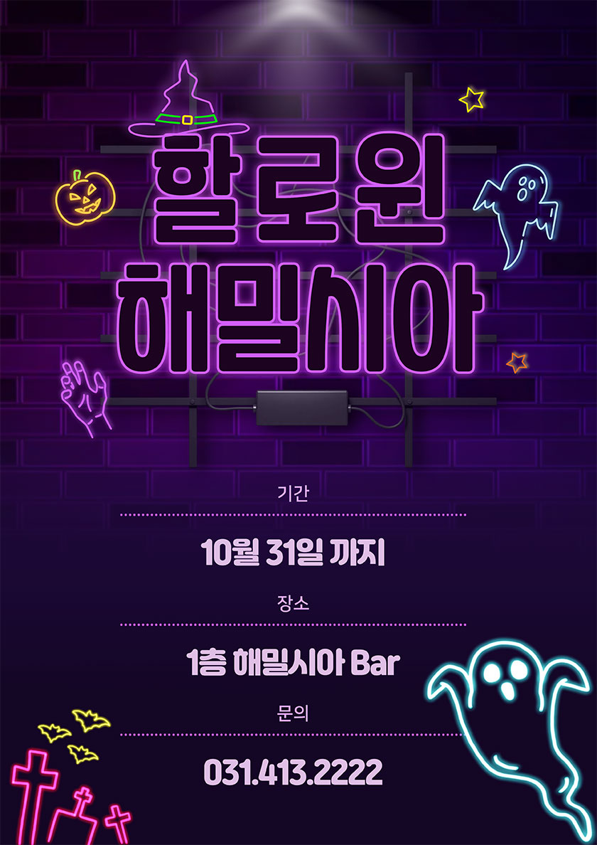 이벤트 상세 혜택 [할로윈 이벤트] 할로윈 해밀시아 이벤트 노을 질 무렵 할로윈 파티가 시작된다.1층 해밀시아 할로윈 이벤트 이벤트 기간 : 2025/10/14 ~ 2025/10/31 TEL : 031-413-1111 이벤트 혜택 이벤트 1) 오싹~오싹~ 할로윈 포토존이벤트 2) 할로윈 한정 칵테일★ 기간 : 10월 31일까지★ 장소 : 엠블던호텔 1층 해밀시아 Bar 이벤트 기간 2025/10/14 ~ 2025/10/31 목록 이전 이벤트 이전 이벤트가 없습니다. 다음 이벤트 [예약 혜택] 송년회, 신년회, 기업연회 예약 이벤트