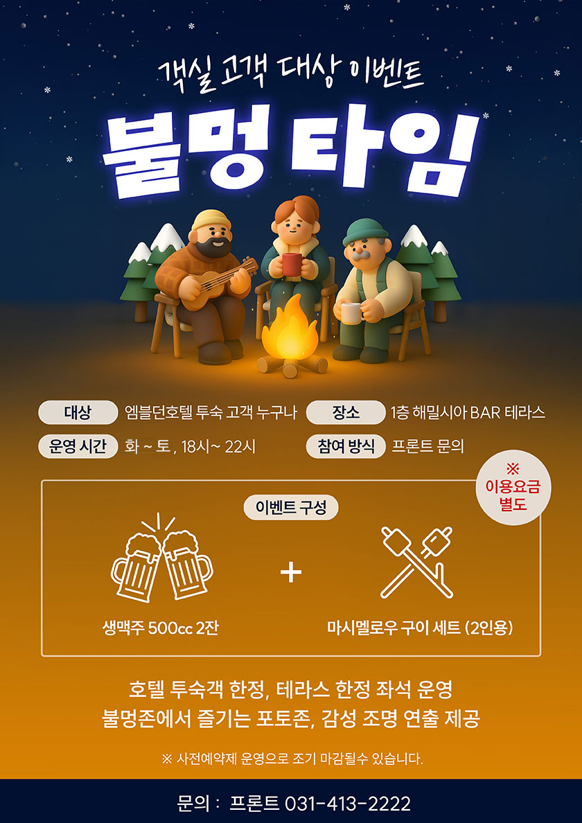 이벤트 상세 혜택 불멍타임 이벤트 도심 속 불빛 아래, 맥주와 마시멜로우로 완성되는 여유엠블던호텔 해밀시아 BAR 테라스에서 느긋한 불멍 타임을 즐겨보세요! 이벤트 기간 : 2025/11/11 ~ 계속 TEL : 031-413-1111 이벤트 혜택 [객실 고객 대상 불멍타임 이벤트]호텔 투숙고객 한정, 테라스 한정 좌석 운영불멍존에서 즐기는 포토존, 감성 조명 연출 제공★ 대상 : 엠블던호텔 투숙 고객 누구나★ 장소 : 1층 해밀시아 BAR 테라스★ 운영시간 : 화~토 18시~22시 운영 ★ 참여방식 : 프론트 문의★ 이용요금 별도※ 사전 예약제 운영으로 조기 마감될 수 있습니다. 이벤트 기간 2025/11/11 ~ 계속 목록 이전 이벤트 Enjoy your lucky pouch 다음 이벤트 [예약 혜택] 송년회, 신년회, 기업연회 예약 이벤트