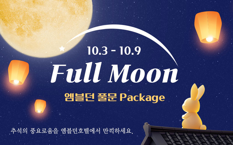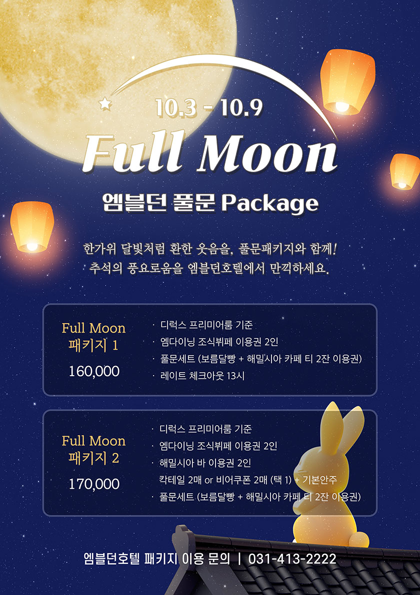 패키지 상세 혜택 Full Moon 패키지 한가위 달빛처럼 환한 웃음을, 풀문패키지와 함께!추석의 풍요로움을 엠블던호텔에서 만끽하세요. 패키지 기간 : 2025/10/03 ~ 2025/10/09 TEL : 031-413-2222 패키지 혜택 [풀문 패키지 1]· 디럭스 프리미어룸 기준· 엠다이닝 조식뷔페 이용권 2인· 풀문세트 (보름달빵 + 해밀시아 카페 티 2잔 이용권)· 레이트 체크아웃 13시· 160,000원[풀문 패키지 2]· 디럭스 프리미어룸 기준· 엠다이닝 조식뷔페 이용권 2인· 해밀시아 바 이용권 2인 칵테일 2매 or 비어쿠폰 2매 (택 1) + 기본안주· 풀문세트 (보름달빵 + 해밀시아 카페 티 2잔 이용권)· 170,000원 패키지 기간 2025/10/03 ~ 2025/10/09 패키지 예약 목록 이전 패키지 엠블던 크리스마스 BOX 패키지 다음 패키지 Sweet Day 패키지