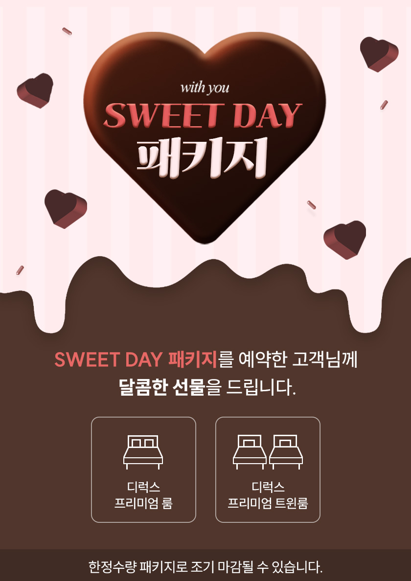 패키지 상세 혜택 Sweet Day 패키지 SWEET DAY 패키지를 이용한 고객님께달콤한 선물을 드립니다. 패키지 기간 : 2025/11/07 ~ 2025/11/15 TEL : 031-413-2222 패키지 혜택 [Sweet Day 패키지]행사기간내 패키지 예약고객에 한해· 디럭스 프리미어룸 or 디럭스 프리미어 트윈룸· 달콤한 pepero 선물※ 한정 수량 패키지로 조기 마감될 수 있습니다. 패키지 기간 2025/11/07 ~ 2025/11/15 패키지 예약 목록 이전 패키지 이전 패키지가 없습니다. 다음 패키지 [할로윈] 하이 할로윈 패키지