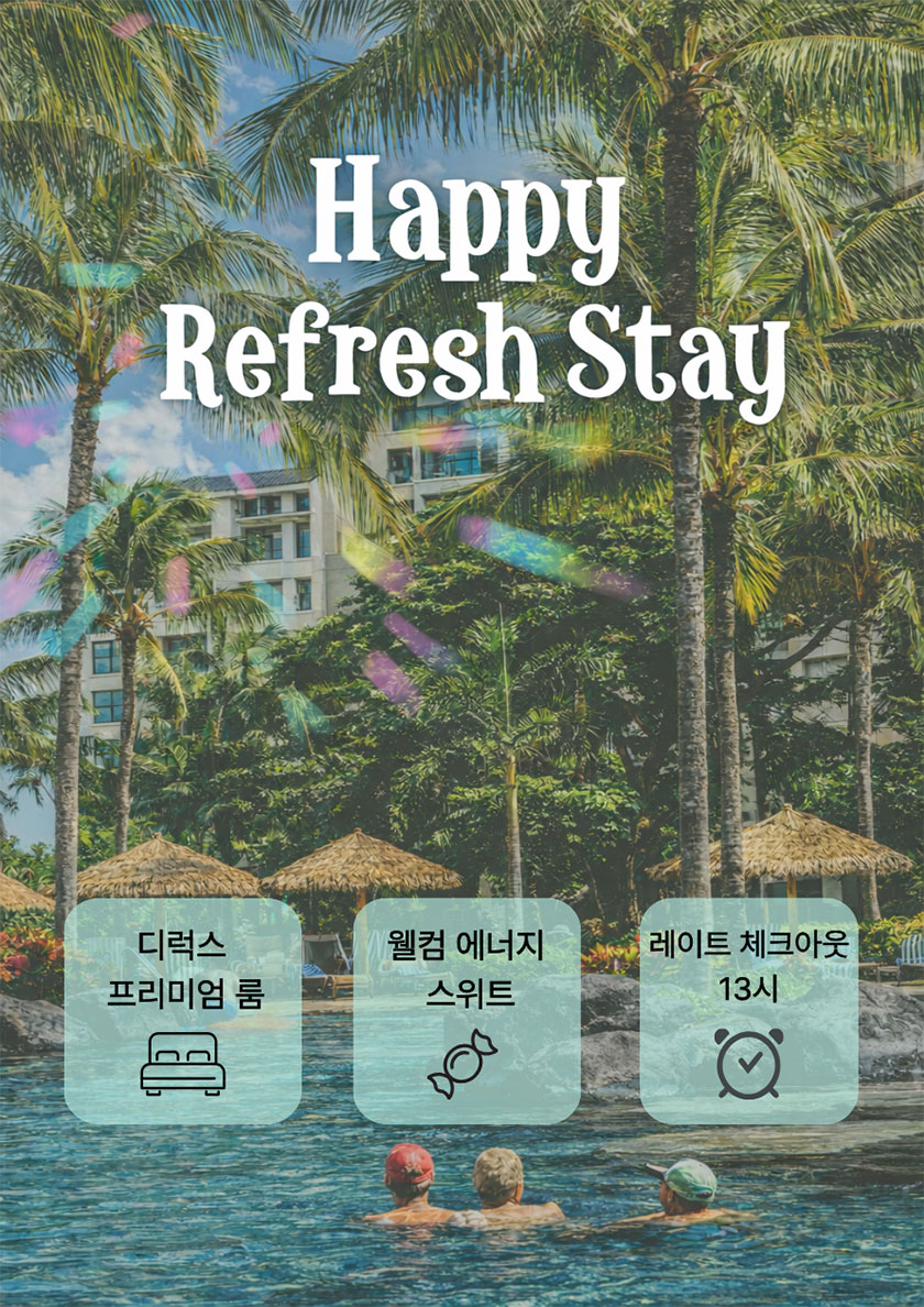 패키지 상세 혜택 해피 리프레시 스테이 패키지 새학기, 새출발 시즌 및 3월 20일 행복의 날 맞아 고객님께 소소한 즐거움을 제공해 드립니다. 패키지 기간 : 2026/03/09 ~ 2026/03/31 TEL : 031-413-2222 패키지 혜택 [해피 리프레시 스테이 패키지]★ 디럭스 프리미엄 룸 + 웰컴 에너지 스위트 + 레이트 체크아웃 13시★ 2026년 3월31일까지 (주중판매 : 일~ 목요일)패키지 문의전화 031-413-2222 패키지 기간 2026/03/09 ~ 2026/03/31 패키지 예약 목록 이전 패키지 이전 패키지가 없습니다. 다음 패키지 애프터 워크 비어 스테이