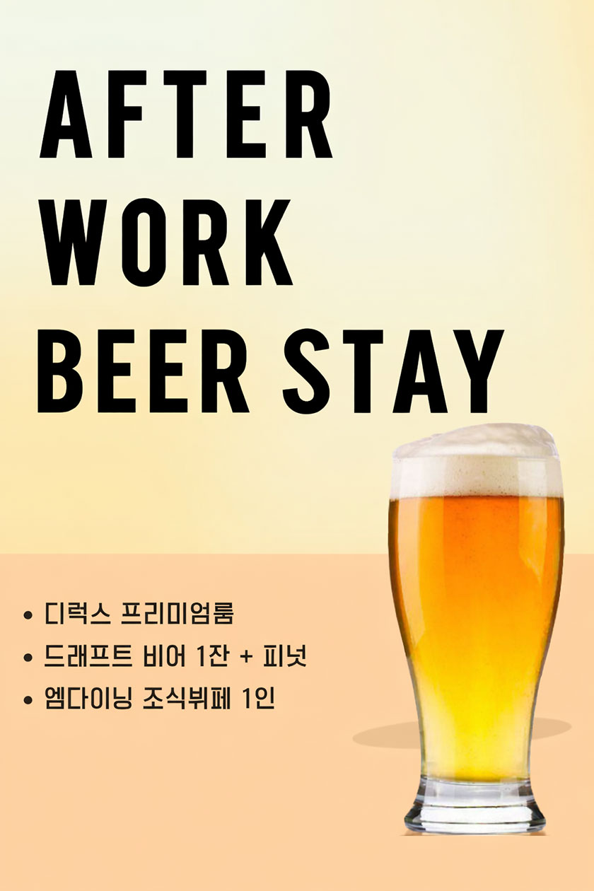 패키지 상세 혜택 애프터 워크 비어 스테이 바쁜 하루를 마친 당신을 위한 작은 휴식출장객 및 1인 투숙객 위한 힐링형 패키지 패키지 기간 : 2026/03/09 ~ 계속 TEL : 031-413-2222 패키지 혜택 [애프터 워크 비어 스테이]★ 디럭스 프리미엄 룸 + 애프터워크 드래프트 비어 1잔 + 피넛 + 엠다이닝 조식 뷔페 1인 ★ 해밀시아 바 18:00 ~ 22:30패키지 문의전화 031-413-2222 패키지 기간 2026/03/09 ~ 계속 패키지 예약 목록 이전 패키지 해피 리프레시 스테이 패키지 다음 패키지 커플 칵테일 스테이 패키지